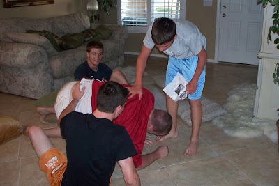 Brandon finally wrestled his dad to the ground, mainly because my hubby was losing wind.(Lay off those chips, Baby.)